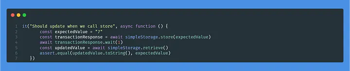 Esse código define um bloco it, que é um teste único dentro do bloco describe do contrato SimpleStorage. O teste faz o seguinte: