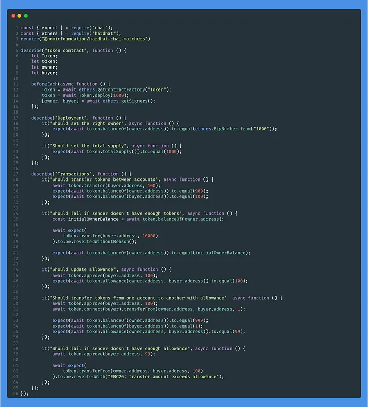 transfer,balanceOfeapprove. - Três testes são definidos dentro do bloco describe.