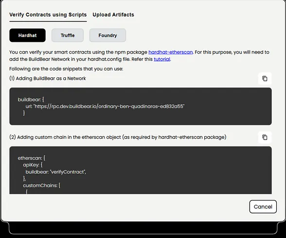 A BuildBear é uma plataforma para testar dApps em escala, para equipes. Ela fornece aos usuários sua própria rede de testes privada para testar seus contratos inteligentes e dApps, que podem ser bifurcados de qualquer cadeia EVM. Ela também fornece uma Torneira, Explorer e RPC para fins de teste.