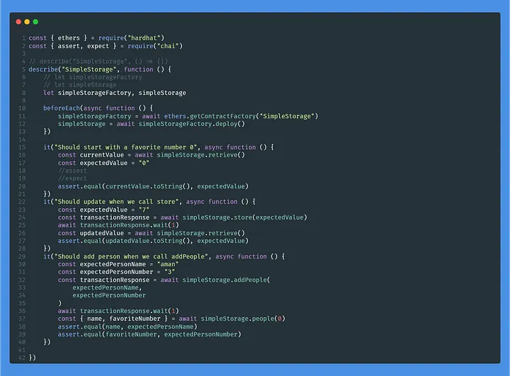 - Este bloco é usado para testar a implantação do contrato e suas propriedades após a implantação.