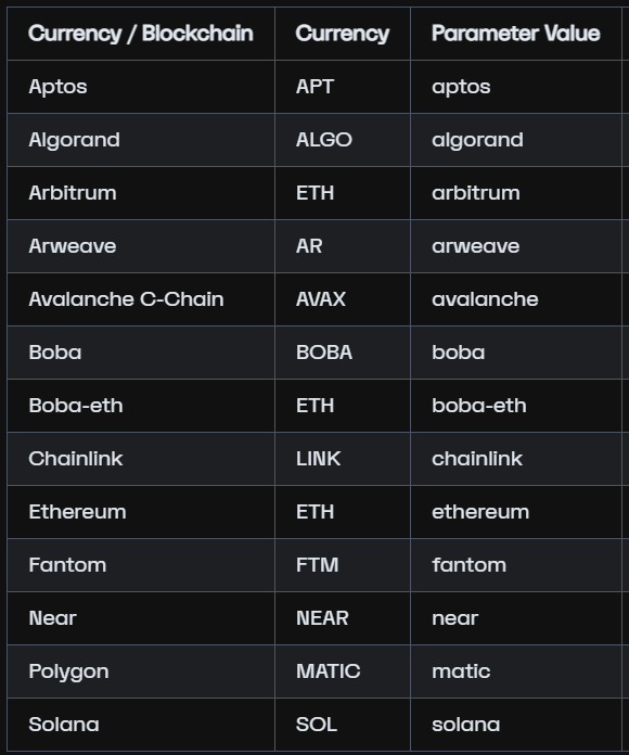 A figura a seguir mostra as moedas suportadas: