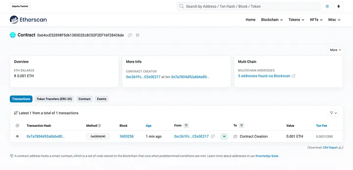 Para validar a implantação, você pode encontrar o endereço do seu contrato no Sepolia Etherscan: