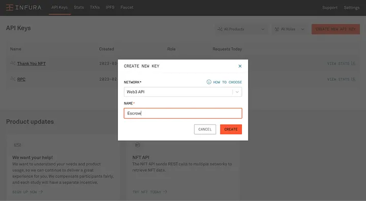 Escolha Web3 API como a rede e nomeie a nova chave com o nome Escrow (embora você possa nomeá-la como quiser).