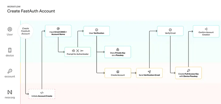 - Inicialização da Transação do Near Core: após a interação do usuário, o sistema Near Core é acionado. Essa inicialização ativa um tipo de ação de transação NEAR chamado "CREATE_ACCOUNT", um passo fundamental no caminho de criação da conta.