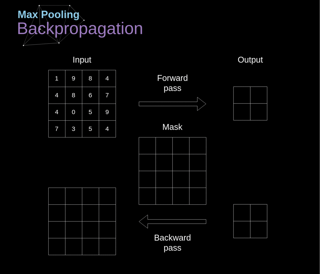 Neste artigo, discutiremos apenas a retropropagação do pooling máximo, mas as regras que aprenderemos - com ajustes mínimos - são aplicáveis a todos os tipos de camadas de pooling. Como nesse tipo de camadas não temos nenhum parâmetro que precisaríamos atualizar, nossa tarefa é apenas distribuir gradientes adequadamente. Como lembramos, na propagação para frente do pooling máximo, selecionamos o valor máximo de cada região e os transferimos para a próxima camada. Portanto, é claro que durante a retropropagação, o gradiente não deve afetar elementos da matriz que não foram incluídos na passagem para frente. Na prática, isso é alcançado criando uma máscara que lembra a posição dos valores usados na primeira fase, que podemos depois utilizar para transferir os gradientes.