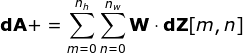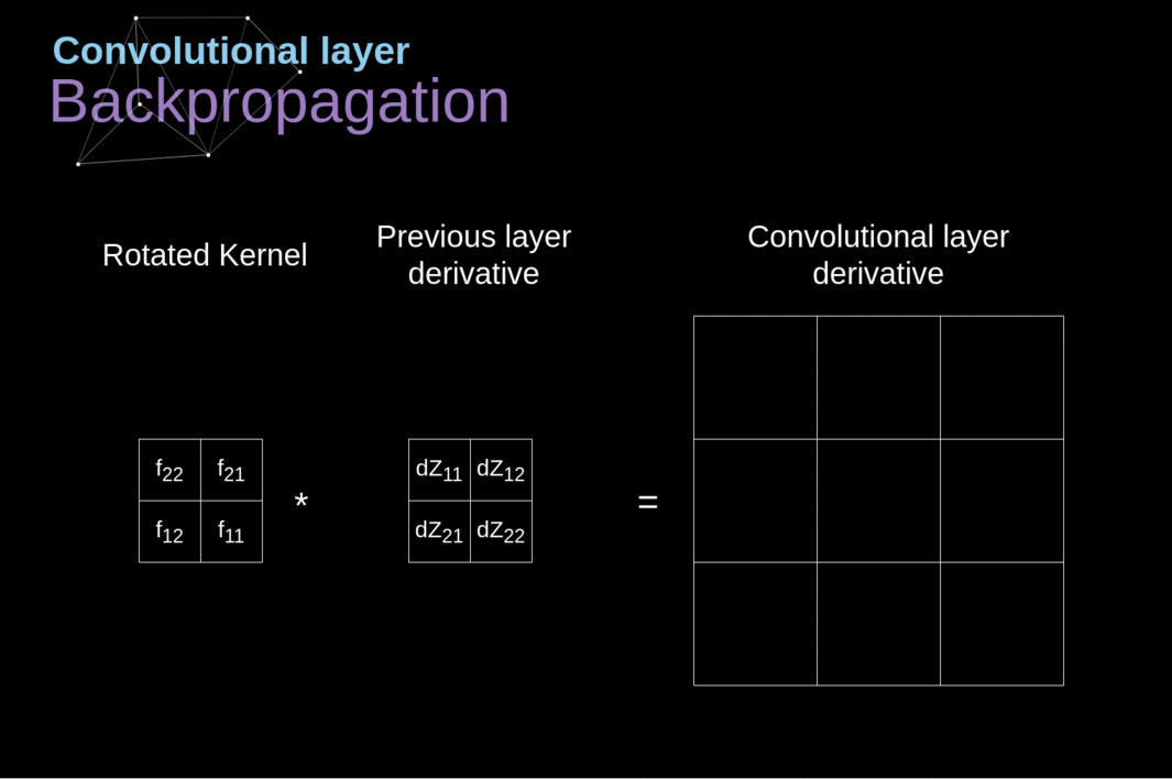 Agora, precisamos lidar com a propagação para trás da própria convolução e, para atingir esse objetivo, utilizaremos uma operação de matriz chamada convolução completa - que é visualizada abaixo. Observe que durante esse processo usamos o kernel, que foi previamente girado 180 graus. Essa operação pode ser descrita pela seguinte fórmula, onde o filtro é denotado por W, e dZ[m,n] é um escalar que pertence a uma derivada parcial obtida da camada anterior.