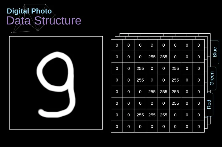 Vamos começar explicando como as imagens digitais são armazenadas. A maioria de vocês provavelmente percebe que elas são, na verdade, enormes matrizes de números. Cada número corresponde ao brilho de um único pixel. No modelo RGB (Red (vermelho), Green (verde) e Blue (azul)), a imagem colorida é composta por três dessas matrizes correspondentes a três canais de cor — vermelho, verde e azul. Em imagens em preto e branco, só precisamos de uma matriz. Cada uma dessas matrizes armazena valores de 0 a 255. Essa faixa é um compromisso entre a eficácia de armazenar informações sobre a imagem (256 valores se encaixam perfeitamente em 1 byte) e a sensibilidade do olho humano (distinguimos um número limitado de tons da mesma cor).