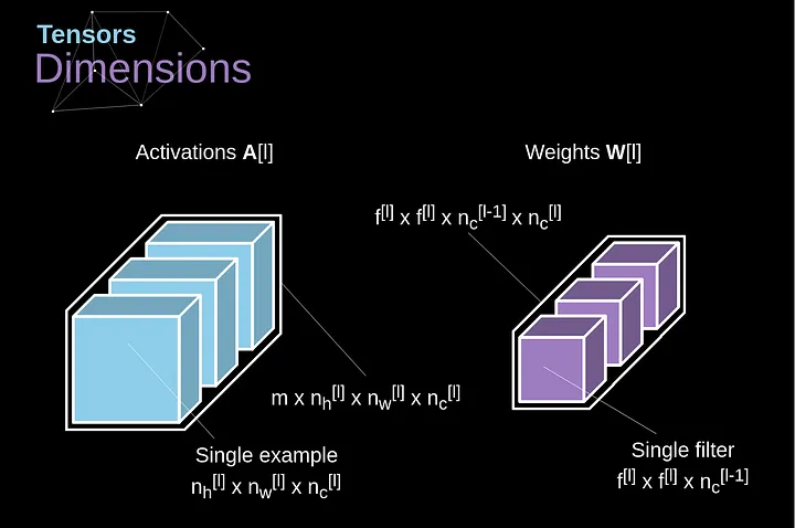 Chegou finalmente o momento de usar tudo o que aprendemos hoje e construir uma única camada de nossa CNN. Nossa metodologia é quase idêntica àquela que usamos para redes neurais densamente conectadas, a única diferença é que, em vez de usar uma simples multiplicação de matrizes, desta vez usaremos a convolução. A propagação para frente consiste em duas etapas. A primeira é calcular o valor intermediário Z, que é obtido como resultado da convolução dos dados de entrada da camada anterior com o tensor W (contendo os filtros), e então adicionar o viés b. A segunda etapa é a aplicação de uma função de ativação não linear ao nosso valor intermediário (nossa ativação é denotada por g). Os entusiastas de equações matriciais encontrarão fórmulas matemáticas apropriadas abaixo. Se alguma das operações em questão não estiver clara para você, recomendo muito meu artigo anterior, no qual discuto detalhadamente o que está acontecendo dentro das redes neurais densamente conectadas. Aliás, na ilustração abaixo, você pode ver uma pequena visualização descrevendo as dimensões dos tensores usados na equação.