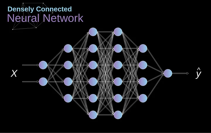 No passado, conhecemos as chamadas redes neurais densamente conectadas. Essas são redes cujos neurônios são divididos em grupos formando camadas sucessivas. Cada unidade desse tipo está conectada a cada único neurônio das camadas vizinhas. Um exemplo de tal arquitetura é mostrado na figura abaixo.