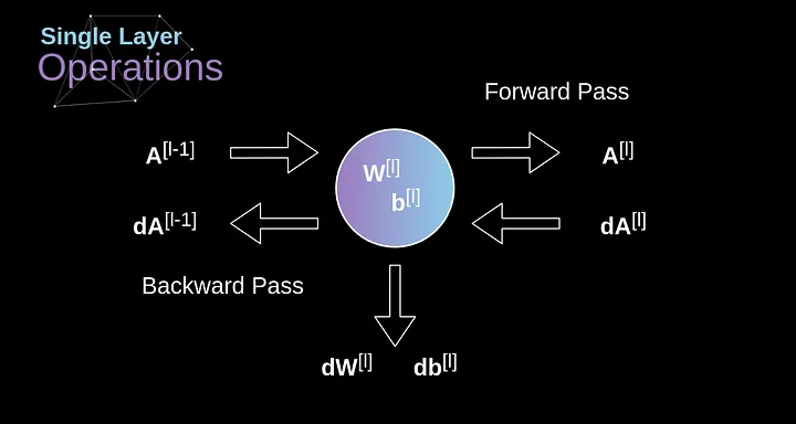 Nossa tarefa é calcular dW[l] e db[l] - que são derivadas associadas aos parâmetros da camada atual, bem como o valor de dA[l -1] - que será passado para a camada anterior. Como mostrado na Figura 10, recebemos dA[l] como entrada. Obviamente, as dimensões dos tensores dW e W, db e b, assim como dA e A, respectivamente, são iguais. O primeiro passo é obter o valor intermediário dZ[l] aplicando a derivada de nossa função de ativação ao nosso tensor de entrada. De acordo com a regra da cadeia, o resultado dessa operação será usado posteriormente.