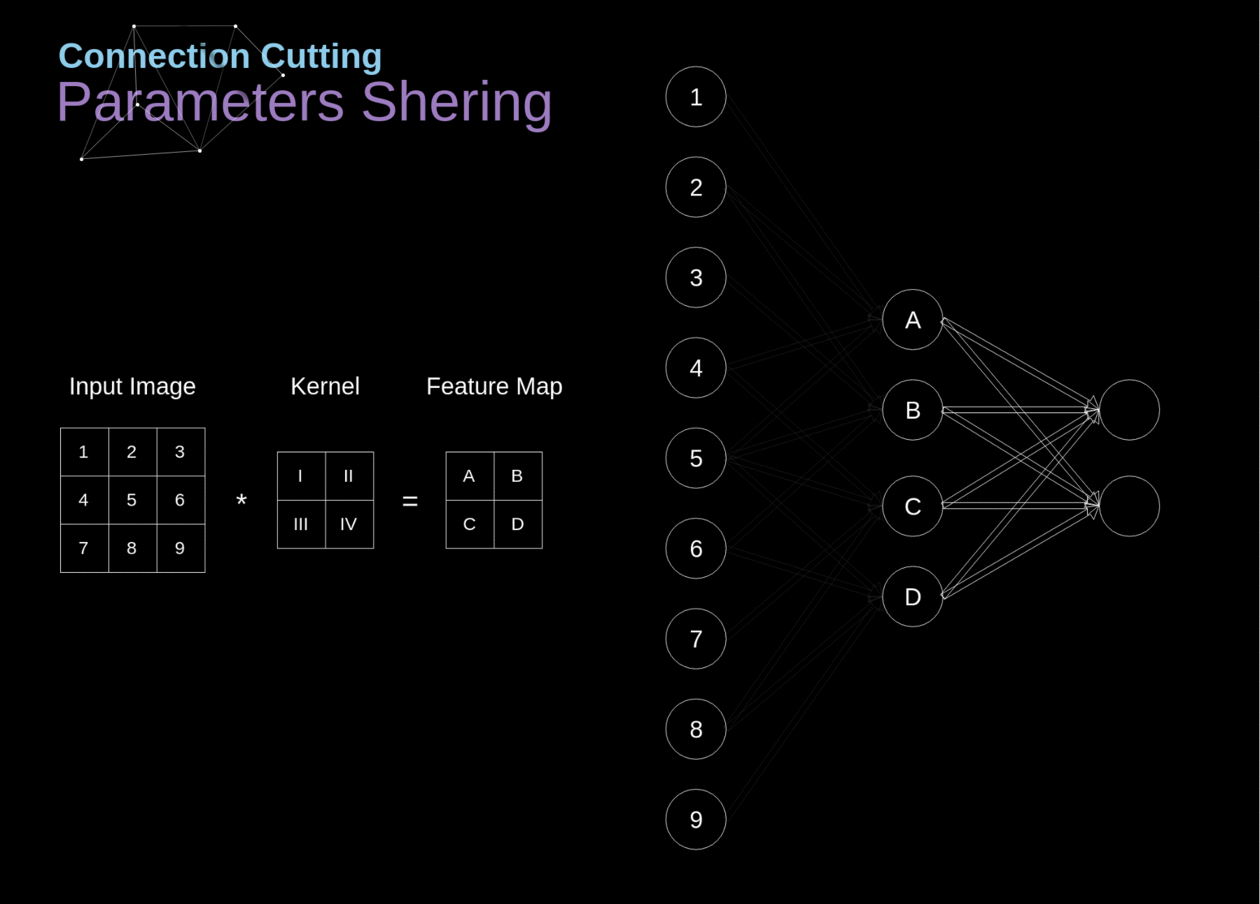 No início do artigo, mencionei que as redes neurais densamente conectadas têm dificuldade em trabalhar com imagens, devido ao grande número de parâmetros que precisariam ser aprendidos. Agora que entendemos do que se trata a convolução, vamos considerar como ela nos permite otimizar os cálculos. Na figura abaixo, a convolução 2D foi visualizada de uma maneira um pouco diferente - neurônios marcados com números de 1 a 9 formam a camada de entrada que recebe o brilho dos pixels subsequentes, enquanto as unidades A-D denotam elementos do mapa de características calculados. Por último, mas não menos importante, I-IV são os valores subsequentes do kernel - esses devem ser aprendidos.