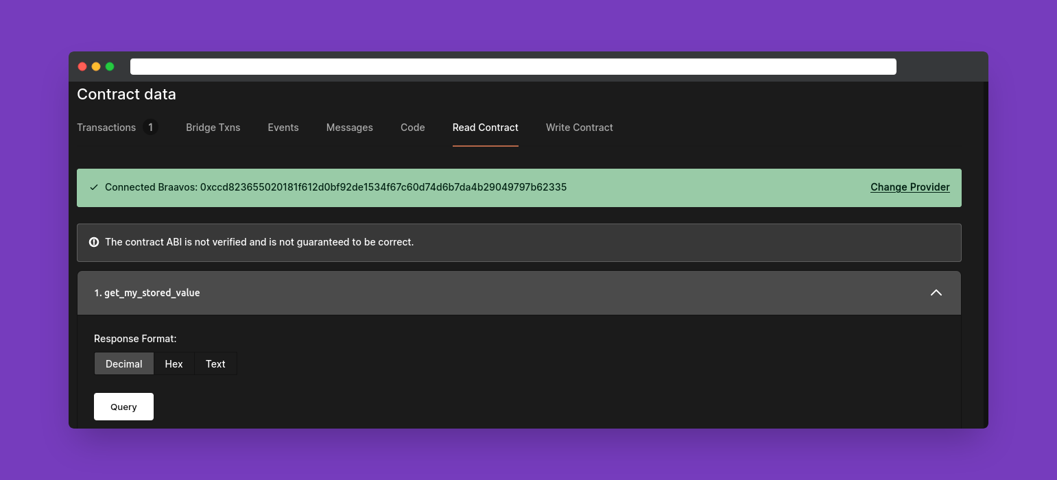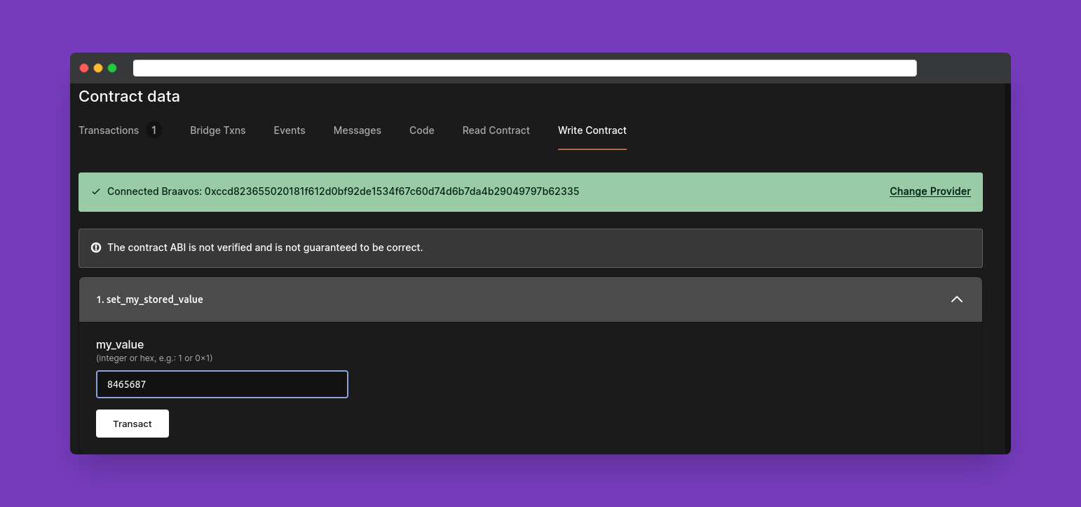 Agora que o contrato inteligente foi implantado na rede de testes da StarkNet, você pode usar o explorador Voyager para interagir com ele.