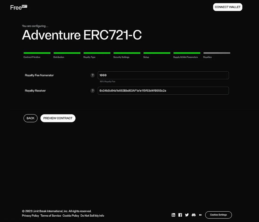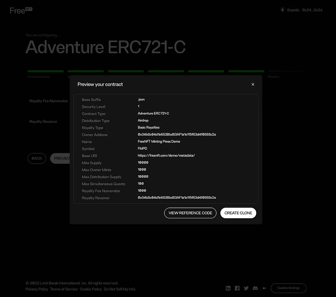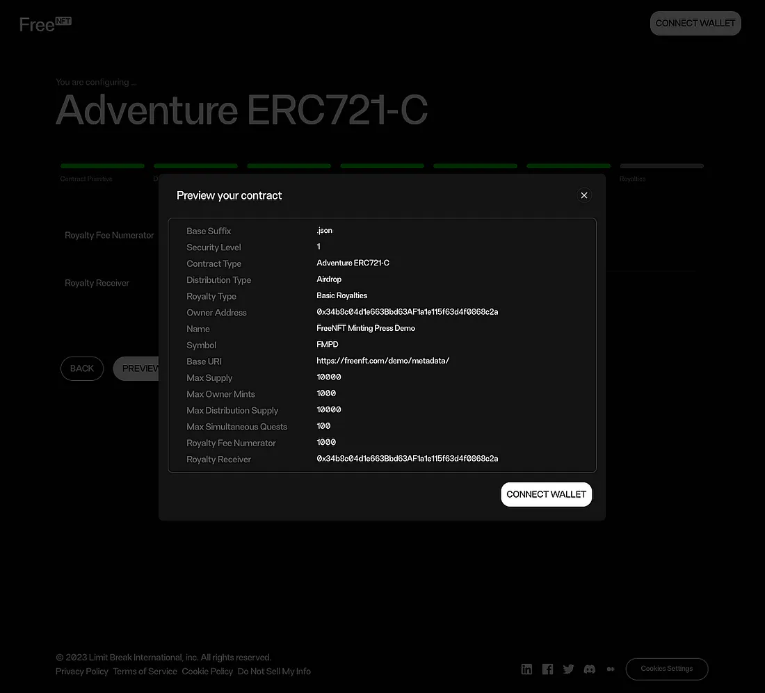 A etapa final de configuração é a dos royalties. Aqui, você insere um número em BPS (100 = 1%) e a porcentagem calculada é exibida abaixo. Uma vez preenchido, você verá um modal de visualização que exibe a configuração do seu contrato. Verifique se todas as configurações são as esperadas e envie a transação.