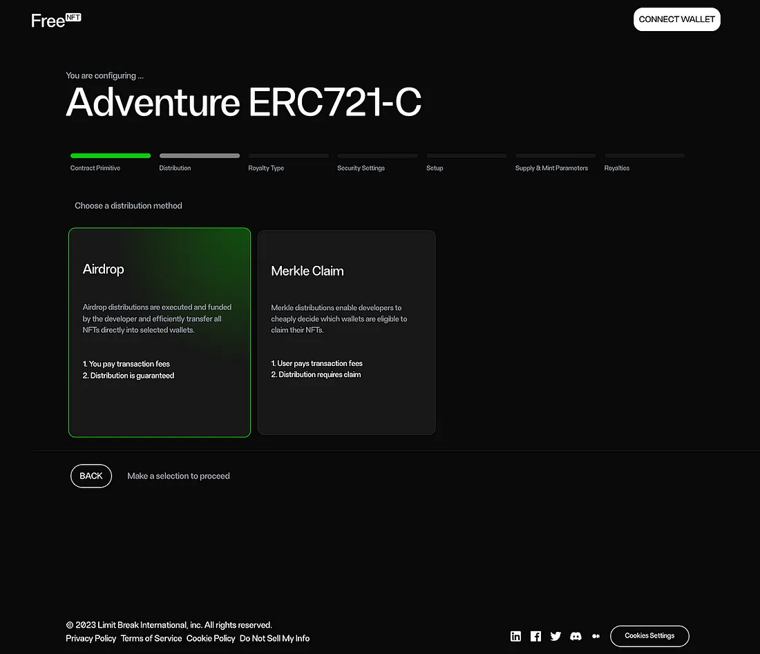 Em seguida, vem o mecanismo de distribuição. Existem 2 opções aqui: Airdrop diretamente aos usuários (o desenvolvedor subsidia as taxas de transação) ou Merkle Claim (os usuários são adicionados a uma lista selecionada pelo desenvolvedor e pagam gás para reivindicar seus tokens). Observe que ao usar o tipo de distribuição airdrop, uma distribuição completa da sua coleção é garantida, enquanto com a distribuição Merkle não há garantia de que cada usuário na lista branca (whitelist) reivindicará seus NFTs.