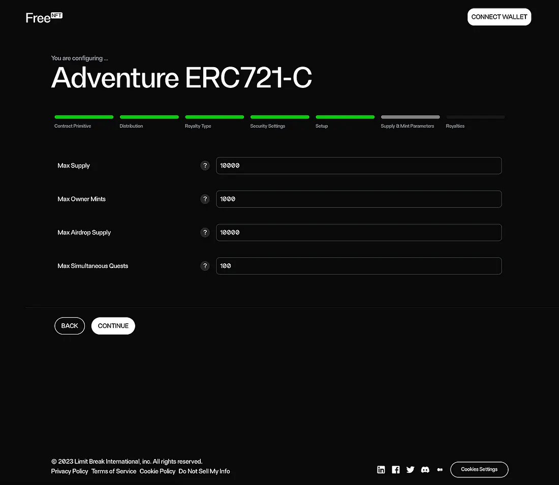 Você também pode definir o número máximo de missões simultâneas nesta etapa se estiver usando o Adventure ERC721-C como primitivo, permitindo "soft staking" (stake flexível) de até 100 missões por vez para um token por contrato inteligente adventure.