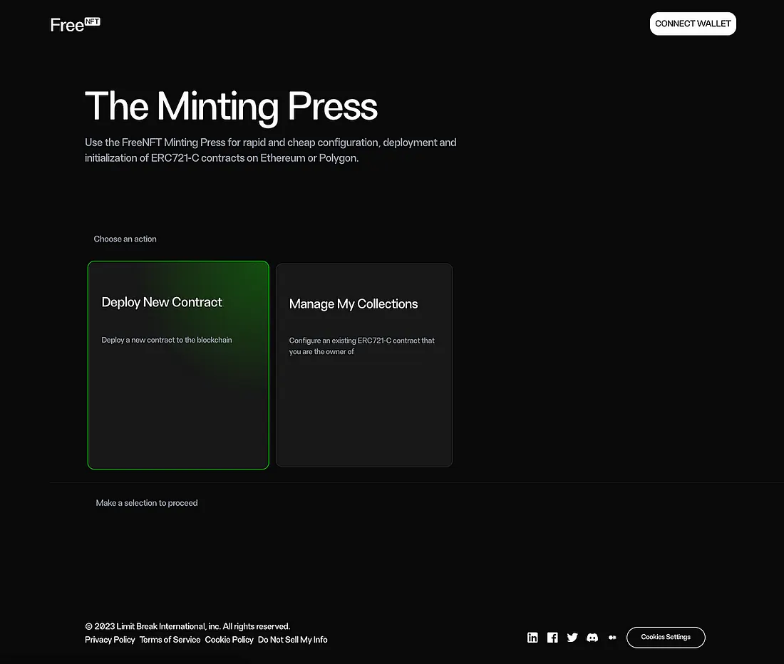 O primeiro passo é acessar https://developers.freenft.com/, onde você verá 2 cartões. Clique em Deploy New Contract (Implantar novo contrato).