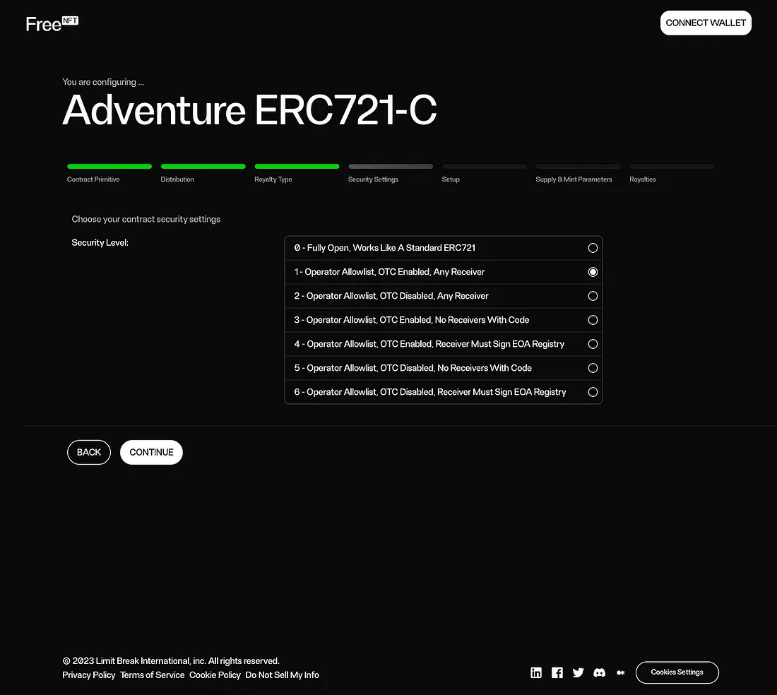 Você pode então decidir sobre o nível de segurança. Este é o cerne do protocolo ERC721-C, permitindo que você defina listas de permissões e crie restrições que garantam conformidade com as regras que você define. Um nível de segurança 0 atua como um ERC721 padrão e não concede proteções explícitas de royalties, então se desejar ter proteções básicas de royalties ou outras restrições, você deve selecionar pelo menos o nível 1. Tokens implantados com nível 1 são automaticamente configurados para usar a lista de permissões de operador gerenciada pela Limit Break, que usaremos para nossos contratos. Se desejar modificar isso, poderá fazer após a implantação.
