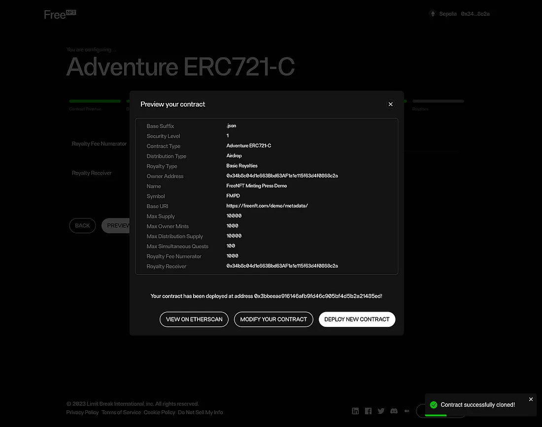 Assim que nossa transação for confirmada, receberemos uma janela de confirmação onde podemos ver o endereço do contrato, visualizá-lo no explorador de blocos da rede ou revisar e modificar a coleção. Nosso NFT totalmente configurado foi implantado na Sepolia em https://sepolia.etherscan.io/address/0x3bbeeae916146afb9fd46c905bf4d5b2a21485ed#code.
