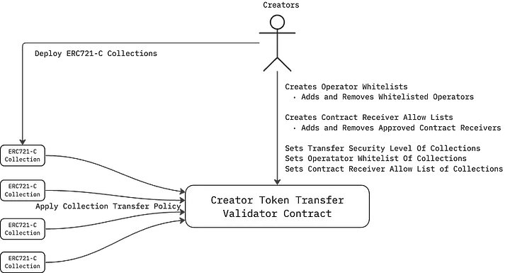 Para garantir totalmente o pagamento de royalties e conformidade com outras regras aplicáveis, o ERC721-C implementa políticas mais restritivas, habilitando e desabilitando a negociação de balcão (OTC) e restrições de receptor.