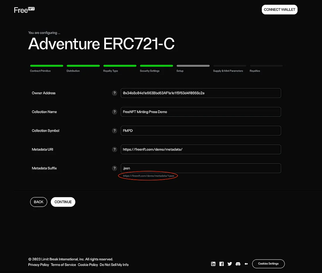 Aqui, você insere os dados padrão necessários ao criar um NFT, como o proprietário do contrato pretendido, nome e símbolo da coleção, o URI onde seus metadados estão armazenados e um sufixo opcional. Por razões de segurança, é fortemente recomendado que o proprietário do contrato seja uma carteira multi-assinatura com pelo menos 2/3 das chaves de assinatura necessárias. Se começar com um proprietário de contrato EOA, é fortemente recomendado transferir a propriedade para uma carteira multi-assinatura.