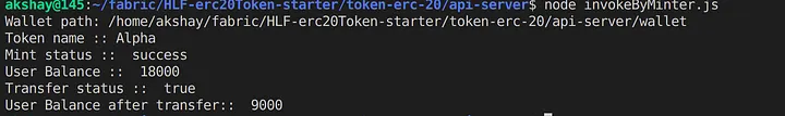 Neste script, estamos buscando o nome do Token, cunhando 18.000 tokens e obtendo o saldo e, em seguida, transferindo 9.000 tokens Alpha para Sita.