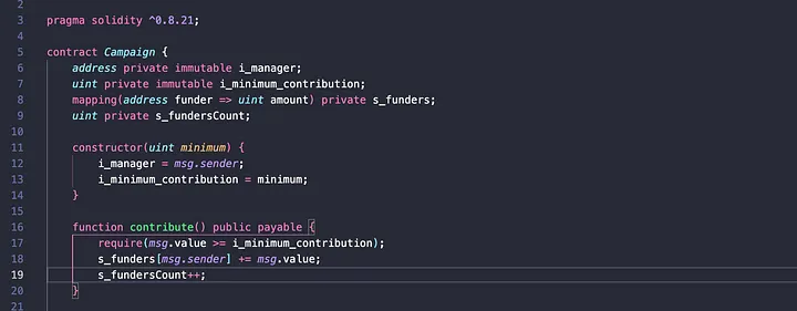 Nós criamos uma função construtora que recebe um uint para o valor mínimo necessário para participar da campanha. Criamos 2 variáveis imutáveis chamadas i_manager e i_minimum_contribution e, em seguida, definimos a variável i_manager como quem criou o contrato e a i_minimum_contribution como o valor passado por eles. Por convenção, defini as 2 variáveis como privadas (isso ajuda a economizar mais gás) e criei funções getter para ler os valores que armazenaram.