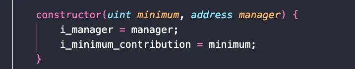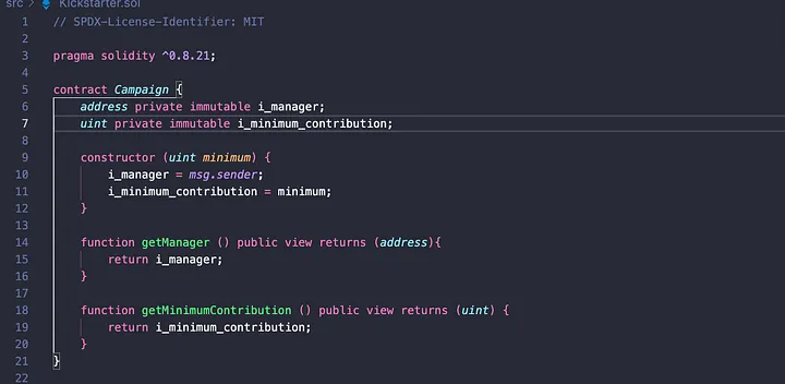 Nós criamos uma função construtora que recebe um uint para o valor mínimo necessário para participar da campanha. Criamos 2 variáveis imutáveis chamadas i_manager e i_minimum_contribution e, em seguida, definimos a variável i_manager como quem criou o contrato e a i_minimum_contribution como o valor passado por eles. Por convenção, defini as 2 variáveis como privadas (isso ajuda a economizar mais gás) e criei funções getter para ler os valores que armazenaram.