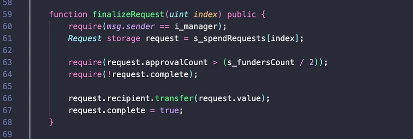 Aqui também exigimos que apenas o gerente possa chamar essa função (uma pequena modificação nisso em breve), obter a solicitação de gastos, exigir que mais da metade dos financiadores da campanha tenha realmente votado e também exigir que a solicitação de gastos não tenha sido concluída inicialmente.