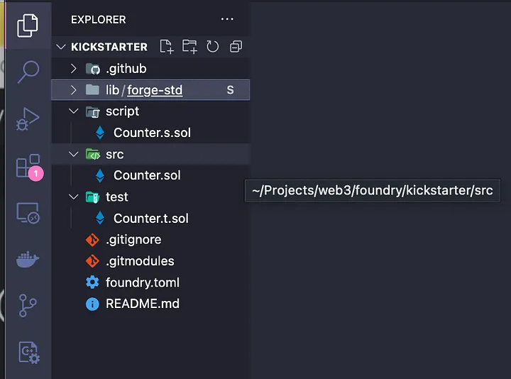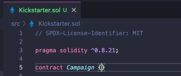 Por padrão, temos as pastas src, script e test, cada uma contendo um contrato inteligente relacionado ao contador. Vá em frente e exclua esses 3 arquivos e crie um novo arquivo Solidity na pasta src chamado "Kickstarter.sol". Não faremos nenhum teste neste artigo, pois isso será abordado extensivamente no meu próximo artigo. O único conteúdo no arquivo Kickstarter é apenas a configuração SPDF, a versão do Solidity e nossa declaração real de contrato chamada "Campaign".