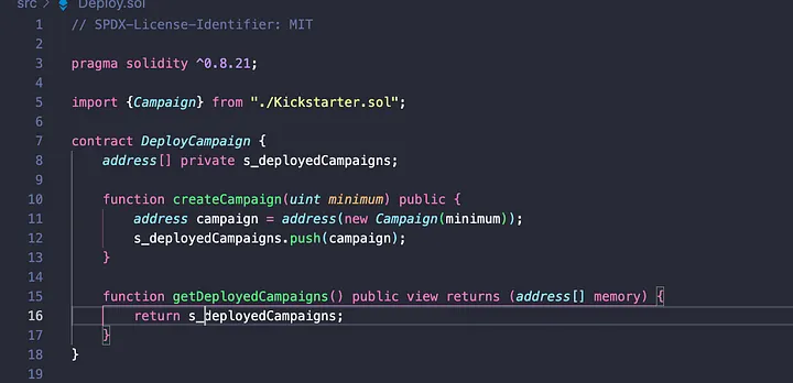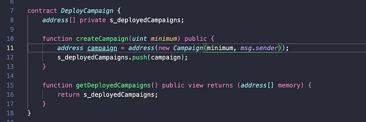 Este contrato é bastante simples, pois temos apenas 2 funções. A primeira cria a campanha e passa o valor mínimo especificado, lançamos a campanha com a palavra-chave address e isso retorna o endereço onde o contrato foi implantado. Salvamos isso em uma variável de armazenamento para a matriz de endereços de todas as campanhas implantadas.