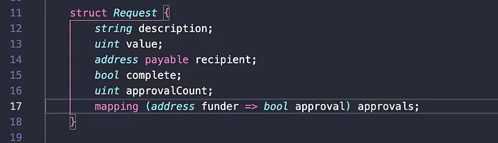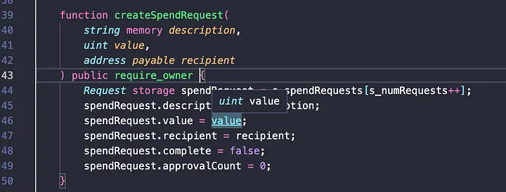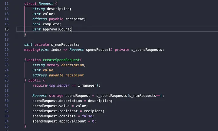 Aqui, temos várias coisas acontecendo. Primeiro, criamos uma estrutura para o nosso tipo de solicitação e, em seguida, criamos uma função para um gerente criar a solicitação de gastos; exigimos que apenas o gerente possa criar solicitações. O destinatário passado como parâmetro na função "createSpendRequest" é definido como "payable", já que pretendemos enviar dinheiro para este endereço se a solicitação de gastos for aprovada pelos financiadores.