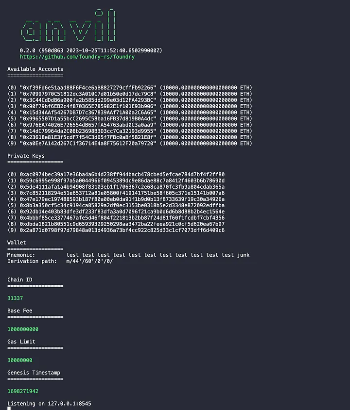 Por padrão (e semelhante ao Remix), o anvil tem algumas contas criadas para nós usarmos e essas contas já foram preenchidas antecipadamente, neste caso, 10.000 ethers cada. Também vemos nossas chaves privadas e nossa Mnemônica de conta.