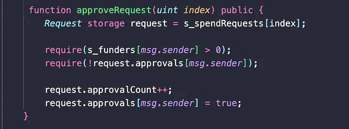 Na nossa função "approve", passamos o índice da solicitação de gastos como parâmetro e obtemos a solicitação nesse índice, armazenando-a em uma variável de armazenamento (novamente, indicando que ela alteraria o valor nesse índice). Em seguida, exigimos que o usuário que chama a função de aprovação tenha realmente contribuído com um valor válido para a campanha e também que não tenha votado inicialmente na solicitação de gastos. Em seguida, aumentamos a variável "approvalCount" e definimos o endereço do financiador como verdadeiro para mostrar que eles votaram.