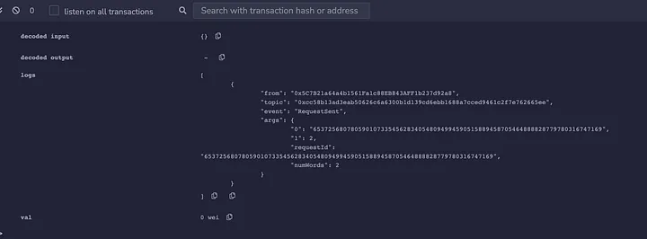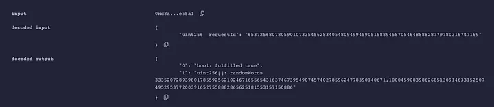 A função getRequestStatus simplesmente mostra as palavras aleatórias solicitadas depois que foram atendidas. A saída decodificada consiste no estado de nossa solicitação, o ID e, em seguida, o mais importante, os valores gerados aleatoriamente pela Chainlink VRF.