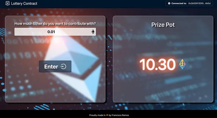 Inspirado por um dos projetos propostos no curso Ethereum and Solidity: The Complete Developer’s Guide (Ethereum e Solidity: O Guia Completo para Desenvolvedores), decidi construí-lo utilizando as mais recentes tecnologias Web3 e melhorá-lo com uma interface de usuário (UI) mais envolvente. A ideia por trás deste jogo é ter um prêmio acumulado e uma lista de participantes. Cada participante entra no jogo enviando uma quantidade de ether para o contrato. O gerente, ou proprietário do contrato, decide quando escolher um vencedor. O total de ether bloqueado no contrato é então transferido para o sortudo.