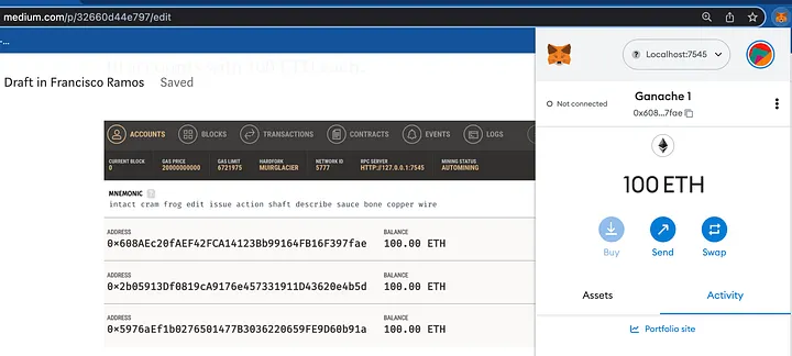 A segunda coisa é uma extensão de carteira em seu navegador para interagir com o aplicativo. Para isso, a MetaMask é uma das melhores opções. O próximo passo é importar as contas fornecidas pelo Ganache para a sua carteira e conectar-se à rede local. Você pode seguir este tutorial para fazer isso.