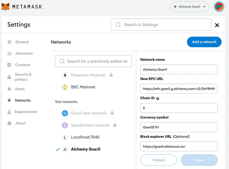 O próximo passo é adicionar a rede Goerli à sua carteira MetaMask, para que você possa ter contas e enviar a si mesmo ETH falso nessas contas, que você pode usar para implantar seu contrato na rede de teste e testar seu aplicativo o quanto quiser. Você pode seguir este tutorial para adicionar a rede, lembrando que o URL RPC pode ser diferente dependendo da plataforma que você está usando. Por exemplo, na Alchemy, o URL se parece com isso: https://eth-goerli.g.alchemy.com/v2/YOUR_API_KEY.