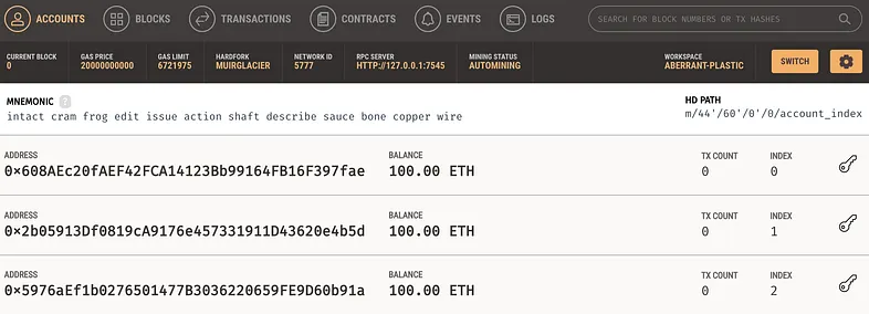 A primeira coisa que você precisa é de uma blockchain rodando em sua máquina local. Como mencionei antes, o Ganache é seu amigo. Ao executar a interface de usuário, você terá 10 contas, cada uma com 100 ETH.