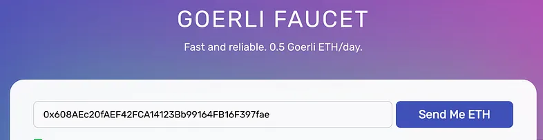 Então você precisa enviar ETH falso (chamo de GoerliETH) para suas contas. Use a Torneira Goerli para fazer isso. É simples, basta copiar e colar sua conta naquela caixa de texto e clicar Send Me ETH (me envie ETH). Você receberá 0,5 ETH, o que é o suficiente para você se divertir um pouco.