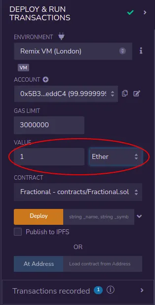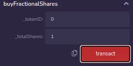 Depois disso, fornecendo a entrada, o ID do token e o total de ações, vamos comprar 1 ação no valor de 1 ether e clicar em transact.