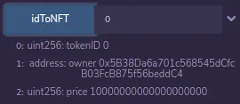 Podemos ver os detalhes do NFT se chamarmos nosso mapeamento IdtoNFT, pressione idtoNFT após adicionar o tokenID 0: