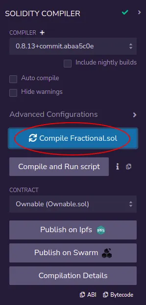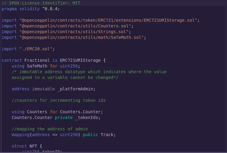 Clique em fractional.sol, você poderá ver o código do contrato inteligente escrito em Solidity.