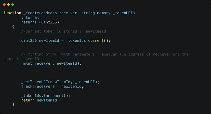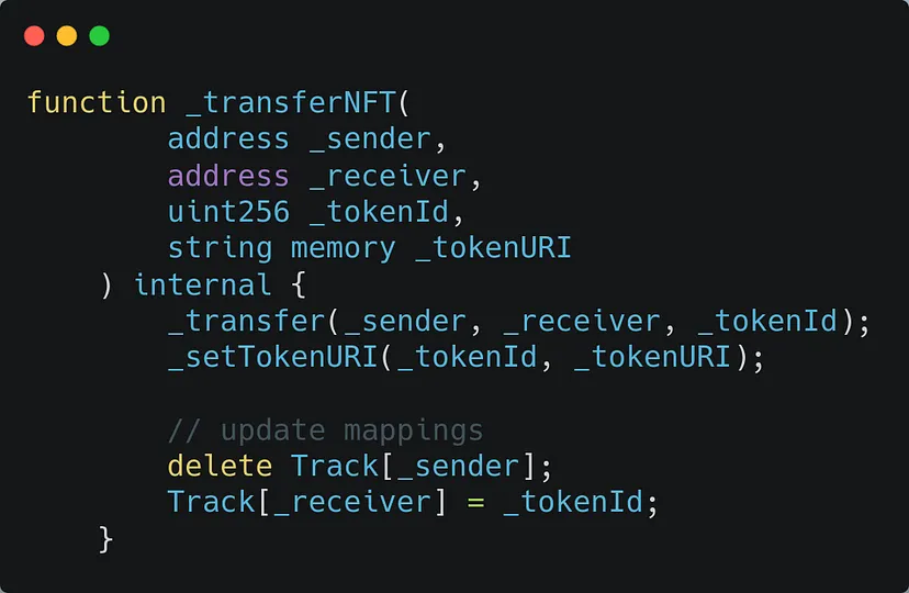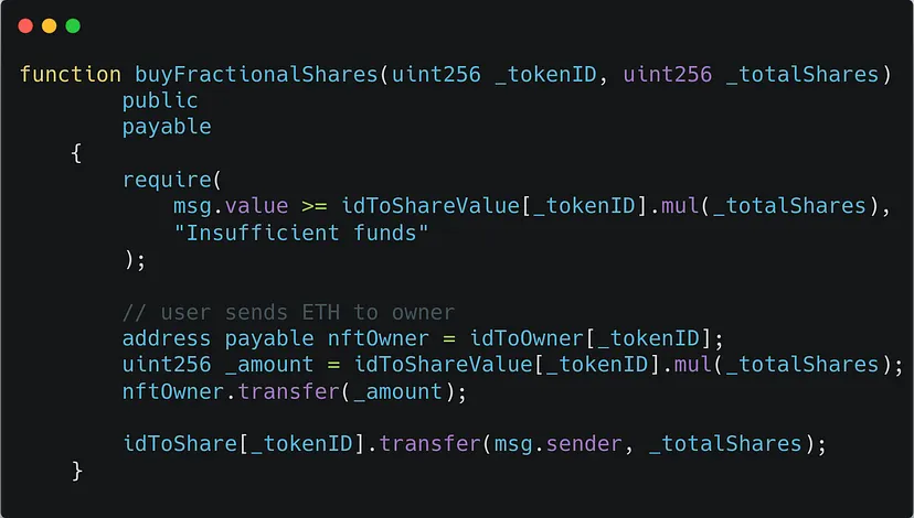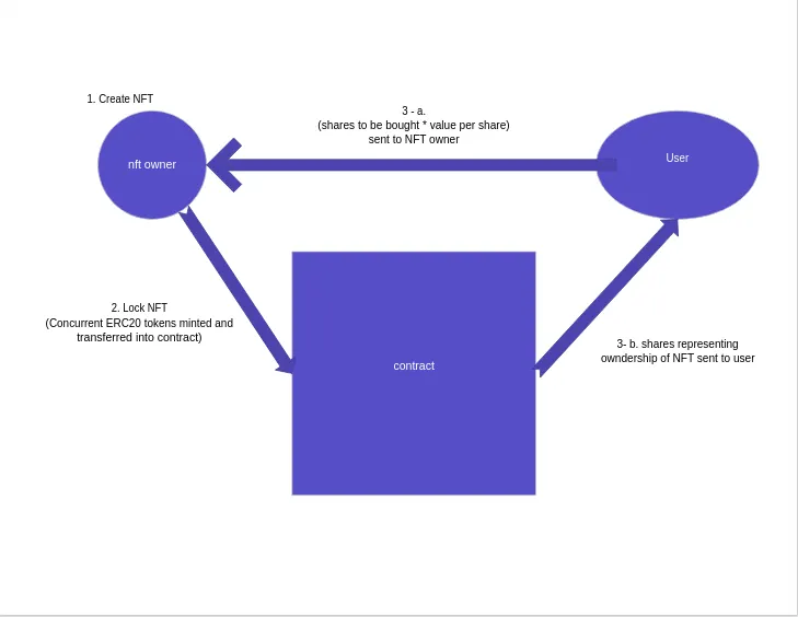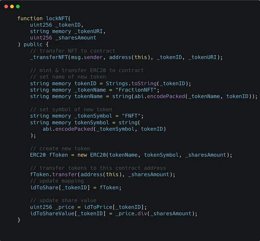 Nesta Função, bloqueamos o NFT transferindo-o para um contrato e criamos o número desejado de tokens ERC-20 como ações.