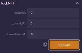 Vamos bloquear o NFT e cunhar o token padrão ERC20 desejado (quantidade de ações) agora, a quantidade total de ações é 10. Portanto, o valor da ação será PREÇO/QUANTIDADE DE AÇÕES, ou seja, 1 ether.