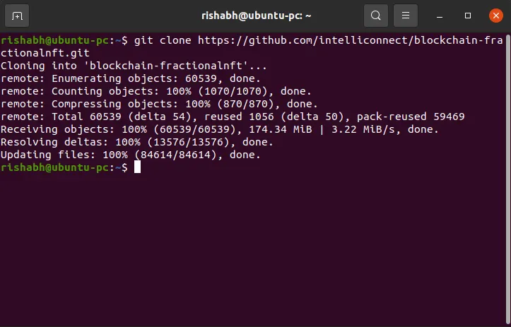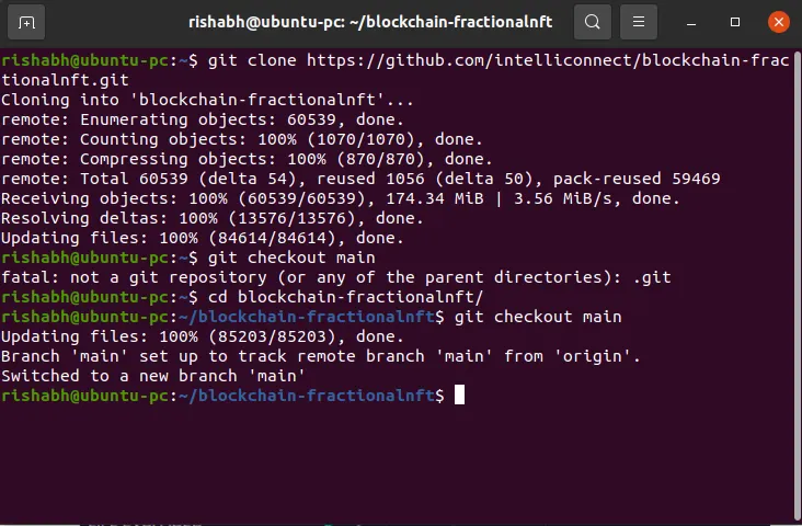 Navegue até a pasta de origem usando “cd blockchain-fractionalnft” e altere a ramificação de master para principal digitando o comando “git checkout main”.