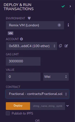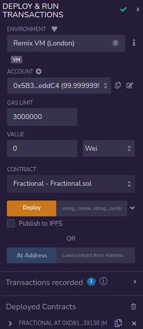 Agora implantamos o contrato inteligente a partir deste endereço de contrato (que se torna o proprietário da plataforma): “0x5B38Da6a701c568545dCfcB03FcB875f56beddC4”