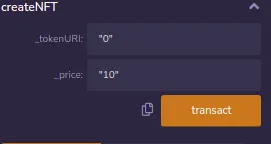 Agora temos essa função createNFT, criamos um NFT colocando esses valores, TokenURI & Price (Preço) do NFT (em ether) e pressionando transact (transacionar). Token URI é apenas o mapeamento associado ao NFT como (0,1,2,3...) para que não haja dois tokens iguais.