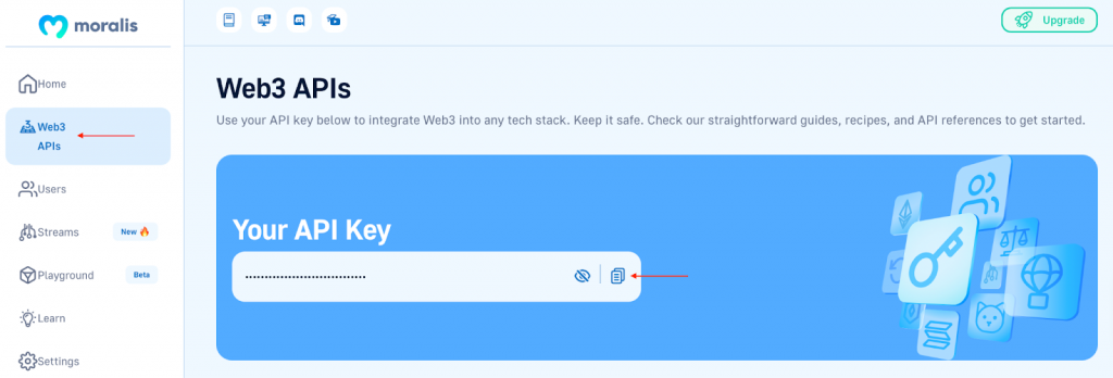 - Configure o Moralis - Cadastre-se no Moralis e obtenha sua chave da API Web3. Depois de se registrar, você pode encontrar sua chave fazendo login e navegando até a guia "Web3 APIs":