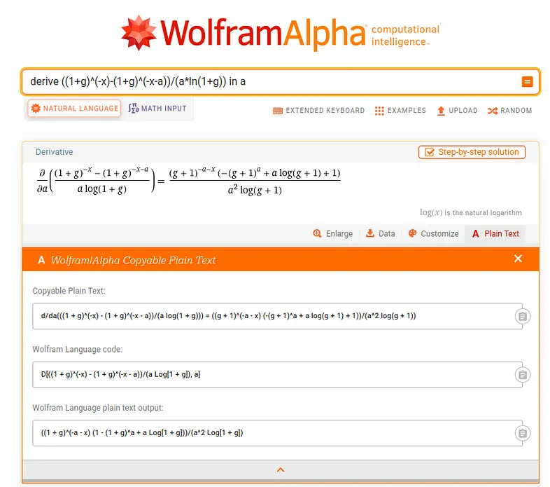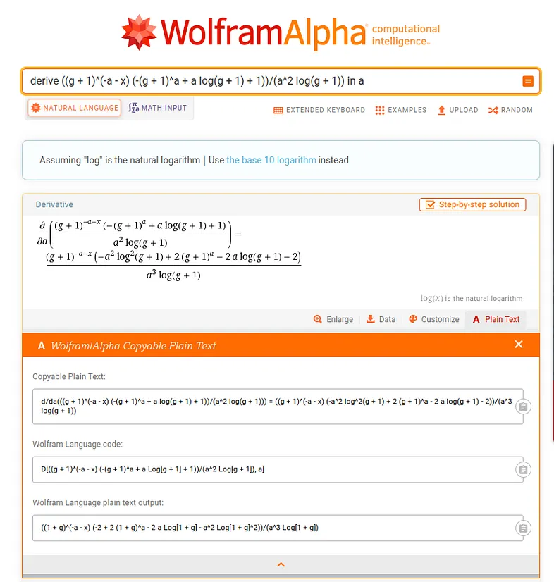 As coisas estão começando a ficar complicadas. L(a) já é uma equação longa e agora precisamos da sua derivada. Vamos usar o WolframAlpha para fazer esse trabalho mecânico por nós: