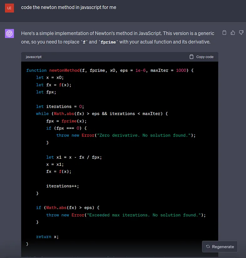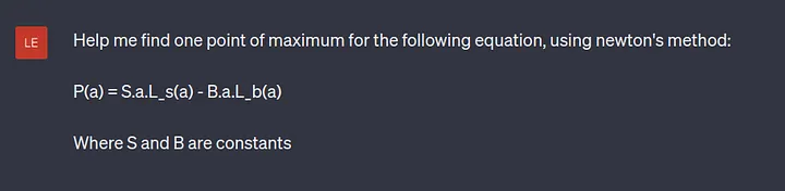Certo, agora temos quase tudo o que precisamos para encontrar essa quantidade absurda de opções. Eu pedi ao ChatGPT para codificar o método de Newton para mim, como você pode ver aqui: